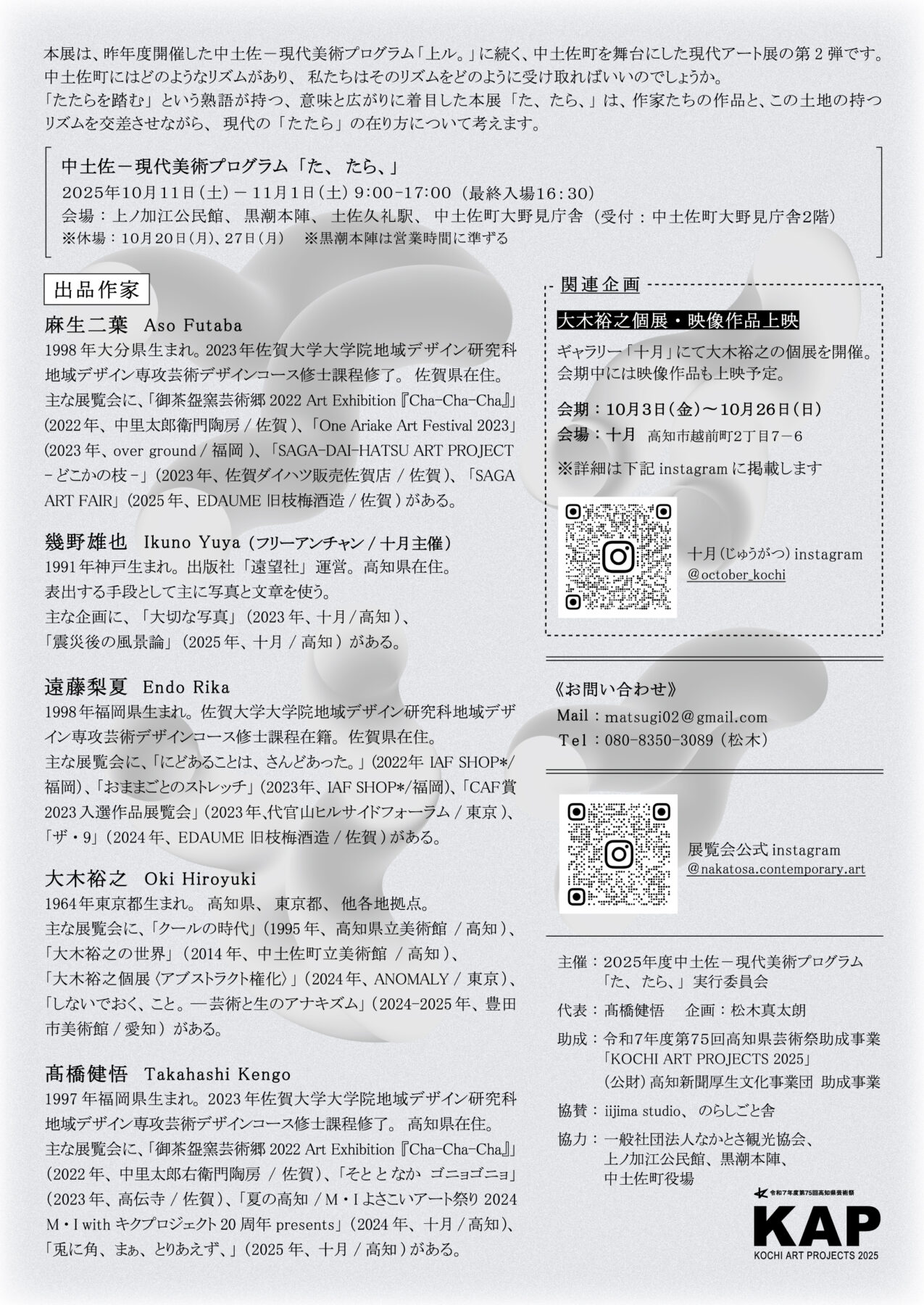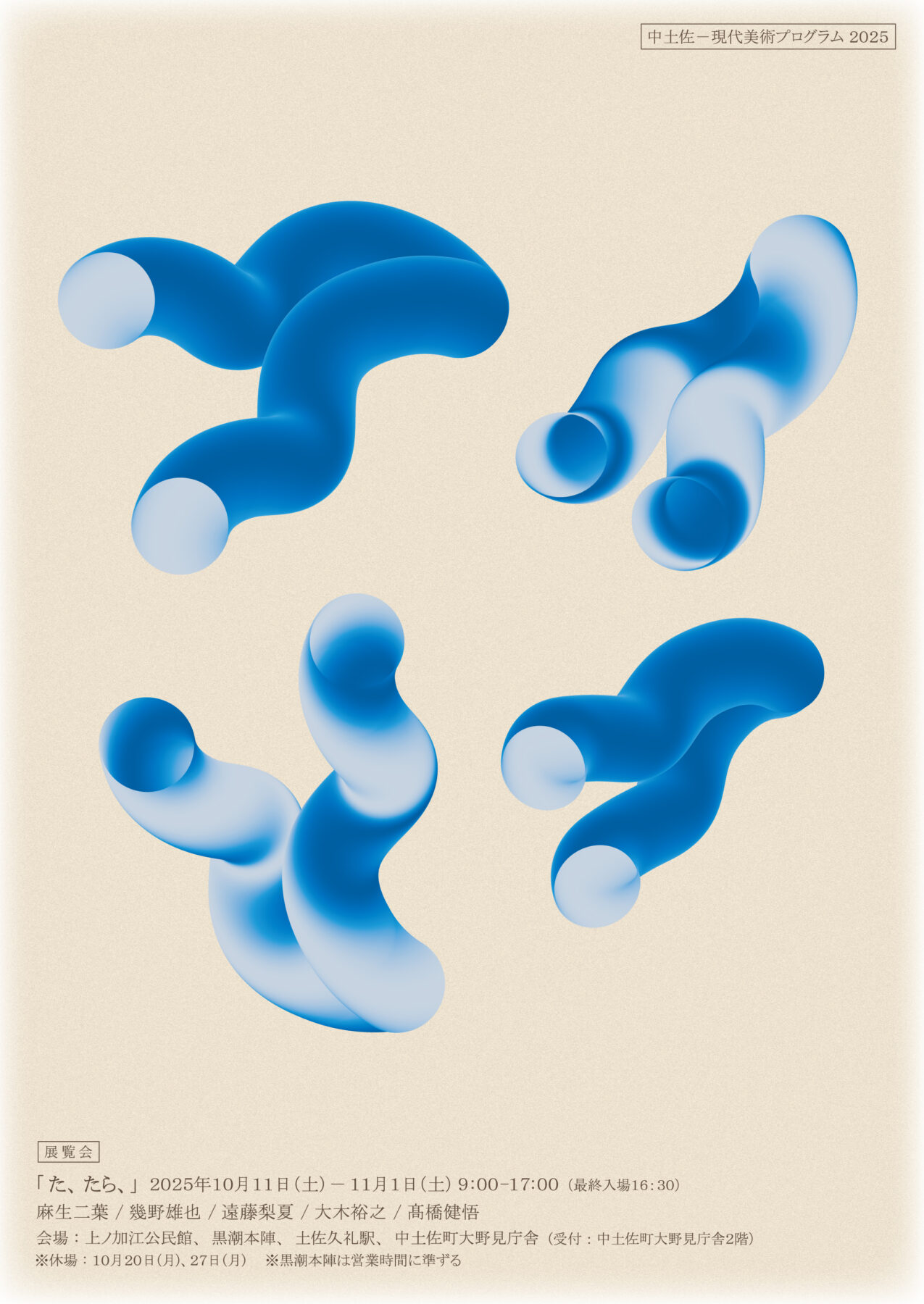 中土佐町2025/10/01 中土佐町がアートに染まる?!現代美術プログラム「た、たら」が10月11日(土)から開催予定! シェアする シェアする 今年も中土佐町を舞台にした現代アート展が10月11日(土)から始まります。 中土佐町大野見で活動されている地域おこし協力隊の高橋さんと仲間の方たち5人が町内の様々な場所に作品を展示します。 展示会場は上ノ加江公民館、黒潮本陣、土佐久礼駅、中土佐町大野見庁舎の4箇所。 中土佐町に芸術が満ちあふれるこの機会をどうぞお見逃しなく! 秋の散策と一緒に、アート巡りをお楽しみください。 前へ ブログ一覧へ