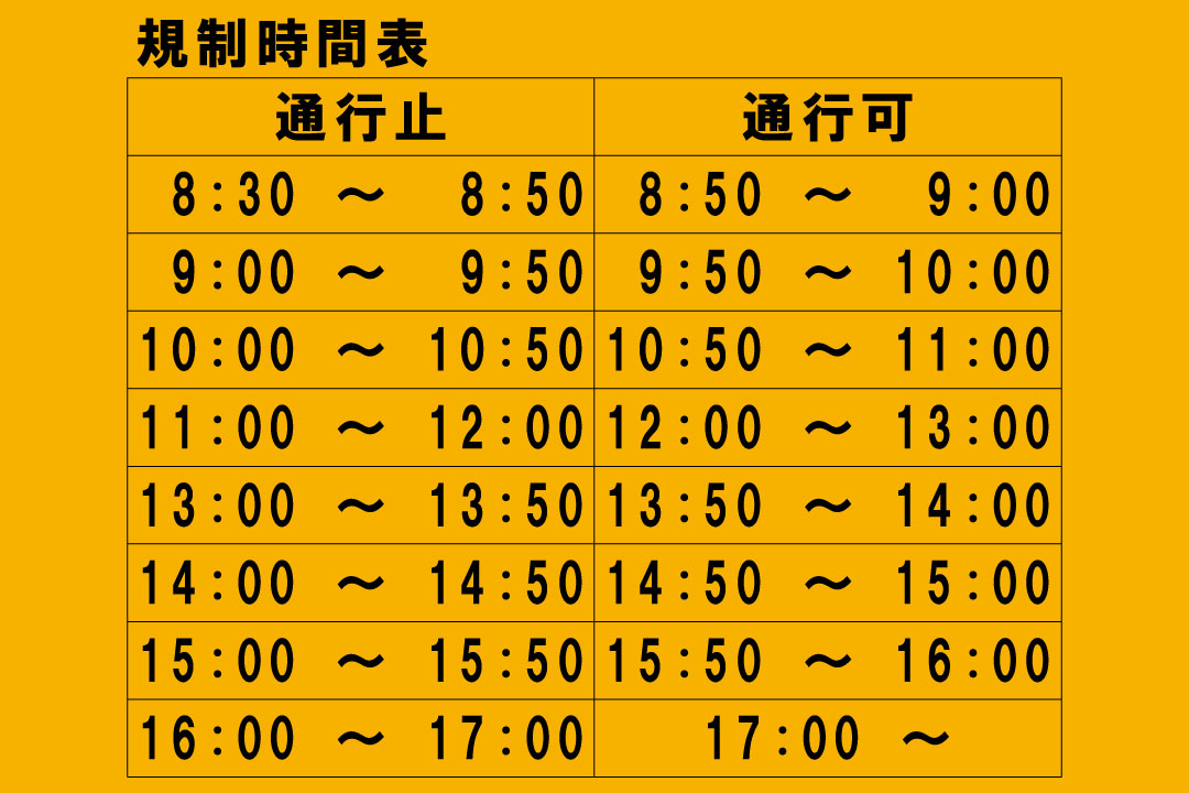 通行可の目安:8:50–9:00/9:50–10:00/10:50–11:00/12:00–13:00/13:50–14:00/14:50–15:00/15:50–16:00/17:00以降。