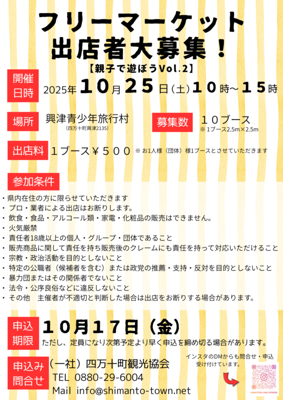 四万十町・イベント情報2025/10/10 【親子で遊ぼうVol.2】フリーマーケット・ワークショップ出店者募集! シェアする シェアする お家にある使わないけれど処分に困っている… そのようなものをぜひこの機会にご出品ください! 興津の美しい海のそばで行われるイベントにて、フリーマーケットとワークショップの出店者を締切を伸ばして募集しています! 締切 10月17日(金) 【お問い合わせ】(一社)四万十町観光協会 TEL 0880-29-6004 前へ ブログ一覧へ 次へ