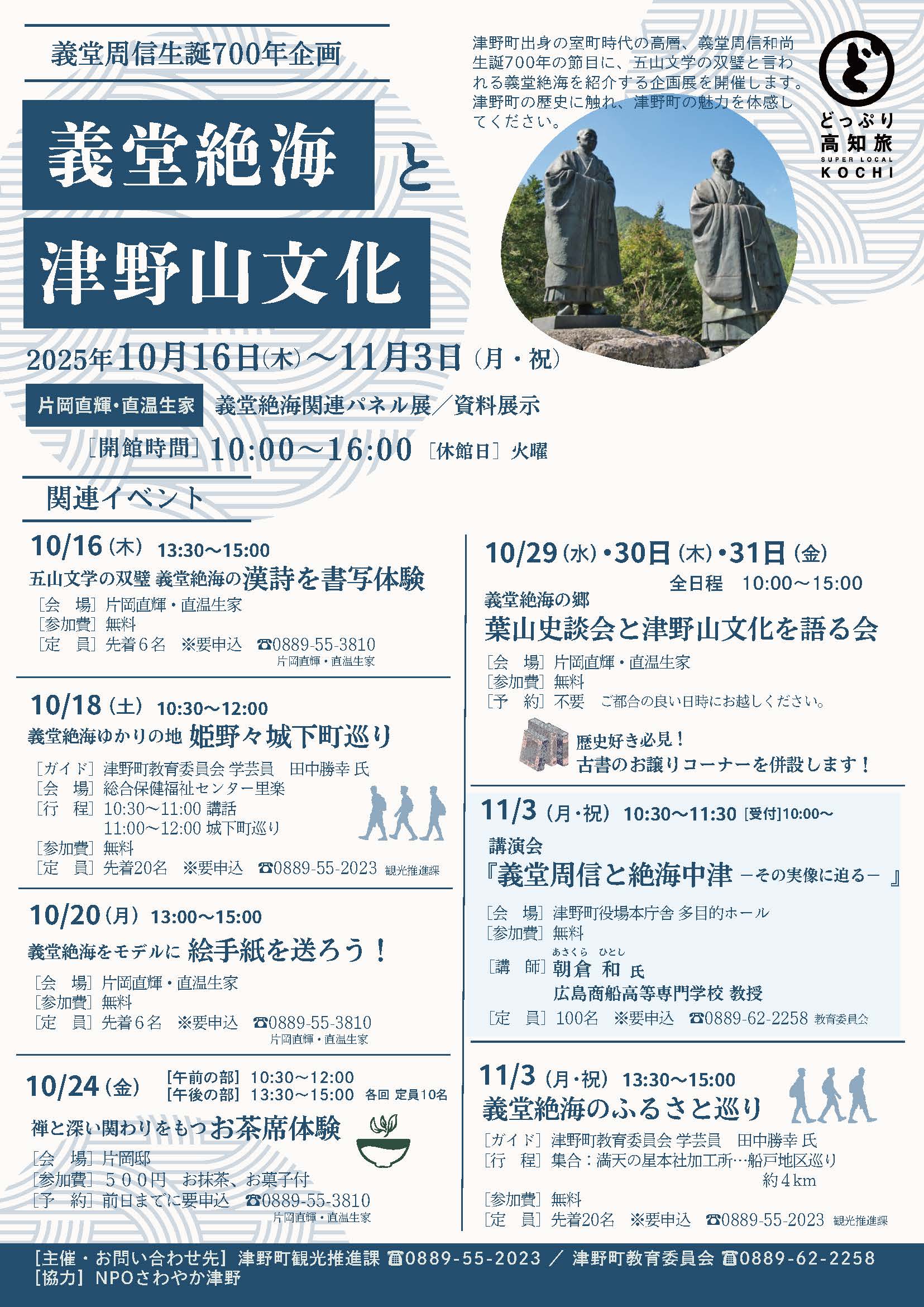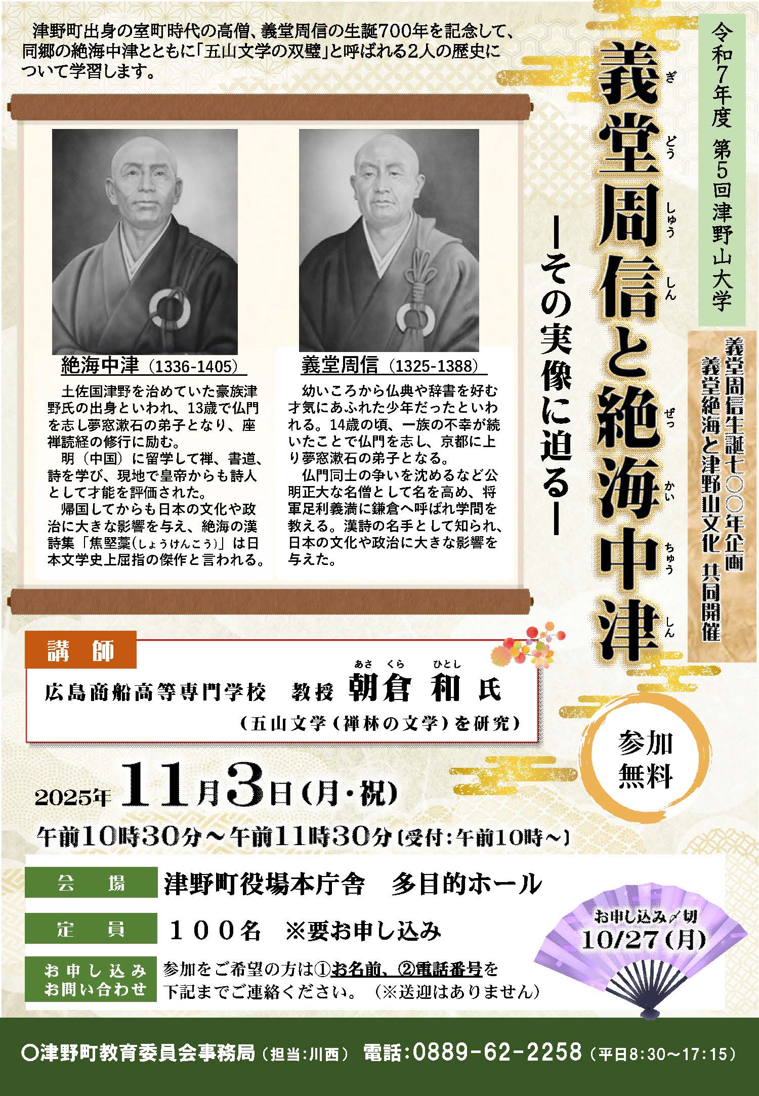室町期に日本文化へ大きな影響を与えた津野ゆかりの高僧、義堂周信と絶海中津。生誕700年の節目に、研究者のお話を通して二人の実像と「五山文学」の魅力に迫ります。