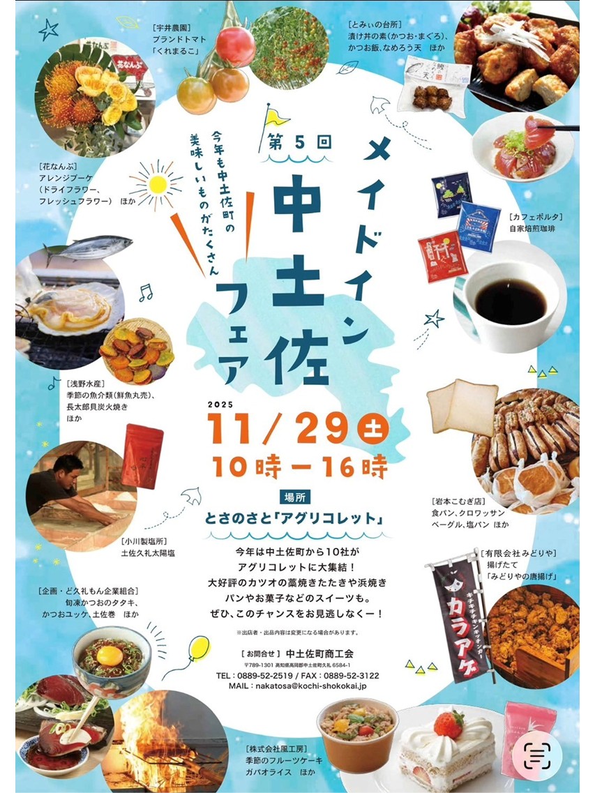 中土佐町2025/11/13 11月29日(土) とさのさと アグリコレット で「メイドイン中土佐フェア」を開催! シェアする シェアする 第5回目「メイドイン中土佐フェア」が今年もアグリコレットで開催されます! カツオはもちろん、パンやスイーツなど中土佐町自慢の商品が一度に勢ぞろい! こんな機会は滅多にない!!! 食べたいもの、買いたいものをチラシでチェックして、29日はアグリコレットへGO!! 問い合わせ先:中土佐町商工会 TEL 0889-52-2519 MAIL nakatosa@kochi-shokokai.jp 前へ ブログ一覧へ