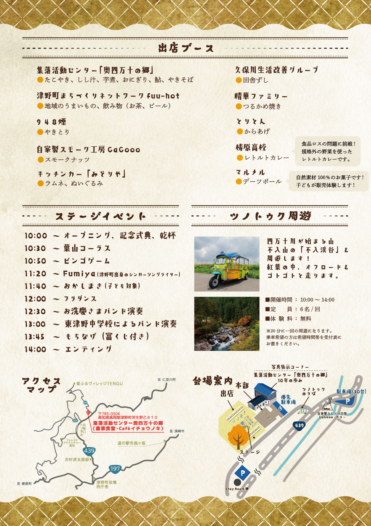 地元のおいしいものや体験ブース、ステージイベント、ツノトゥク周遊など、家族みんなで一日たっぷり楽しめる内容です。