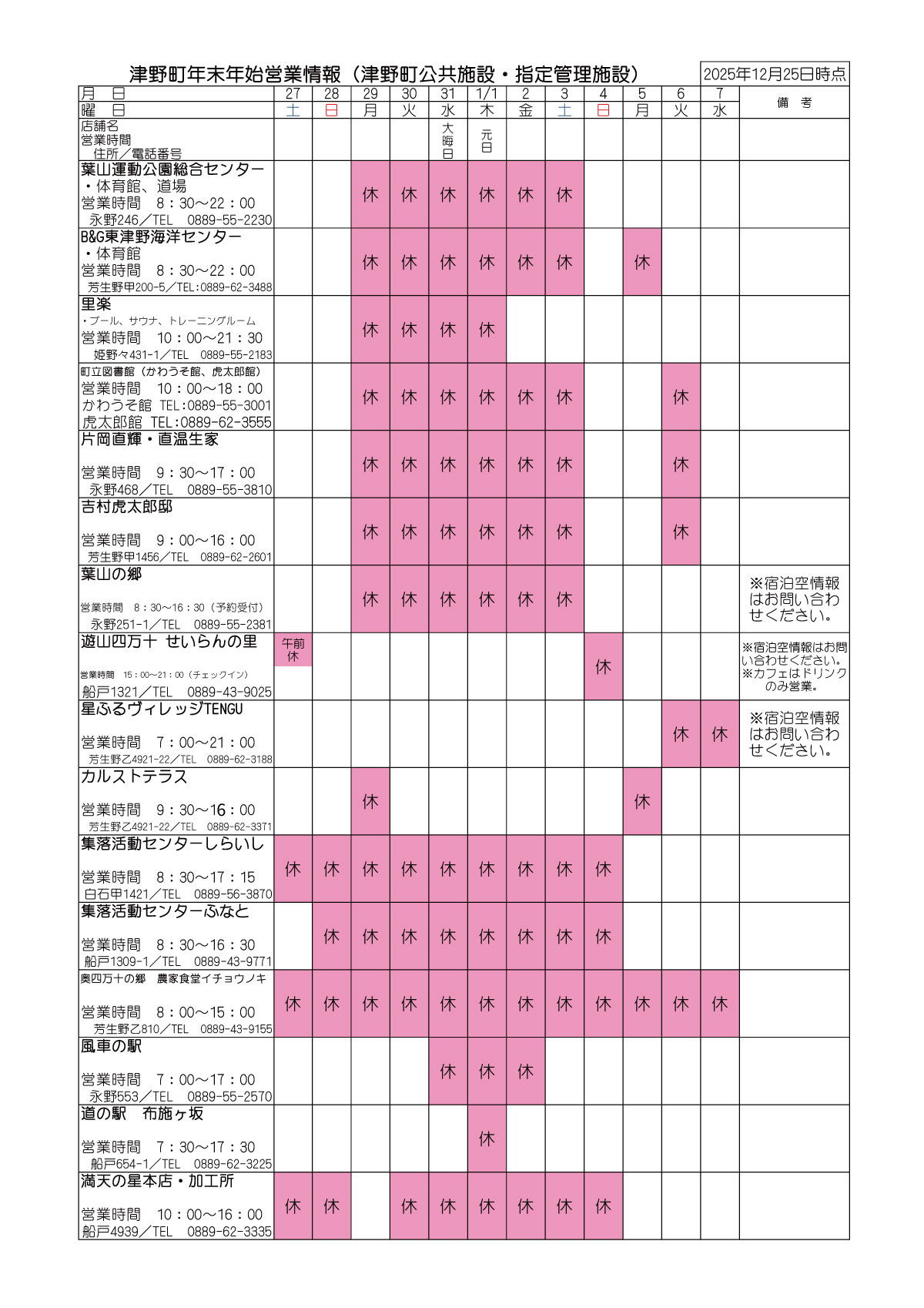 津野町2025/12/25 津野町年末始営業情報 シェアする シェアする 津野町公共施設・指定管理施設の営業情報についてお知らせします。 詳細は各施設へお問い合わせください。 (※掲載情報は、2025年12月25日時点のものです。) 前へ ブログ一覧へ
