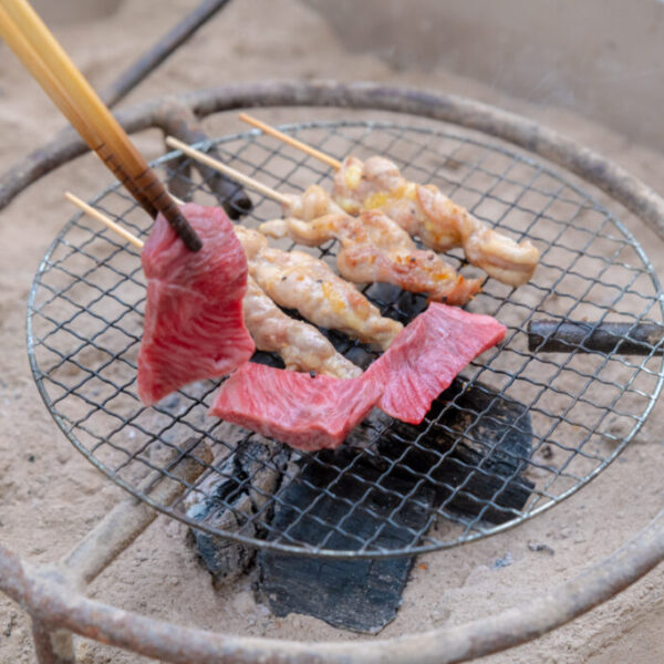 お風呂が沸くまでの時間は、ぱちぱちと燃える囲炉裏を囲んで熱々のおでんや季節の鍋、四国カルスト牛串といった冬のグルメをお腹いっぱい食べましょう。