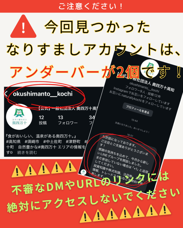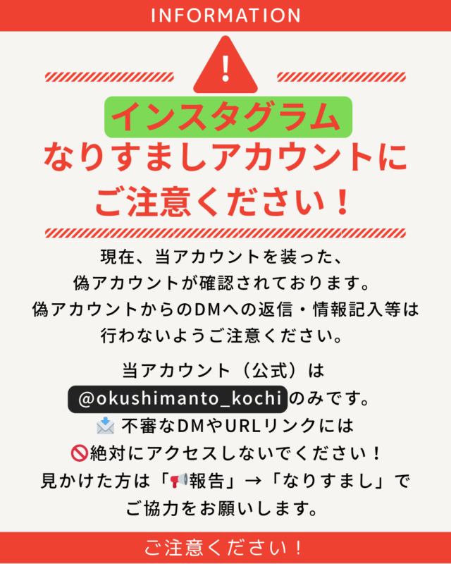 不審なアカウントやDM(ダイレクトメッセージ)の連絡には対応せず、速やかにブロック・通報をお願いいたします。